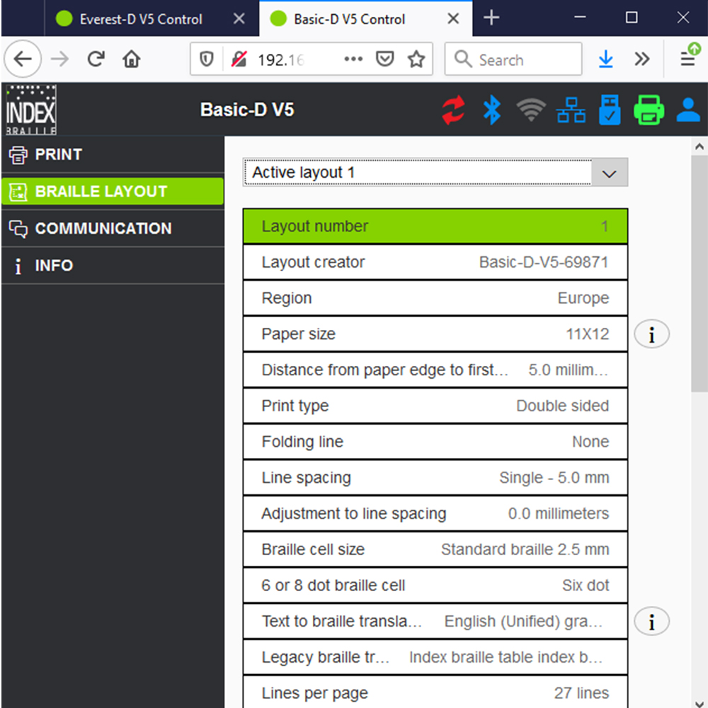 Printer Indeks V5 mendukung antarmuka pengguna BrailleApp. Ini mungkin antarmuka pengguna yang paling intuitif di pasar. BrailleApp dapat diakses saat printer V5 terhubung ke jaringan (kabel atau WiFi). Cukup ketik alamat IP printer pada browser, maka BrailleApp tersaji di perangkat Anda.
